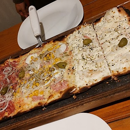 Pizzas de massa fininha e feita com mel Silvestre, a metro além de ser assada em forno à lenha